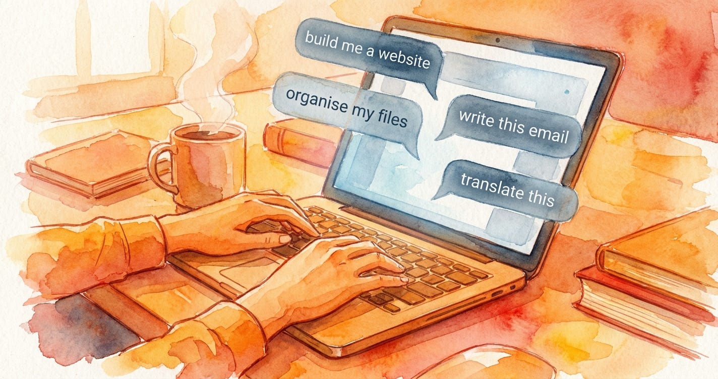 He wasn’t building an app. He wasn’t writing code. He was asking Claude, in plain English, to pull action items from his emails and organise them. Like talking to the world’s most competent intern.